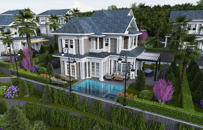Villas for sale in Istanbul, Turkey, in the Bahcesehir area, at reasonable prices for Turkish citizenship. The villas are located within a complex that guarantees safety and comfort for its residents. The project features a swimming pool, green space, and a private garage for each villa. It also offers beautiful views of nature and the city.